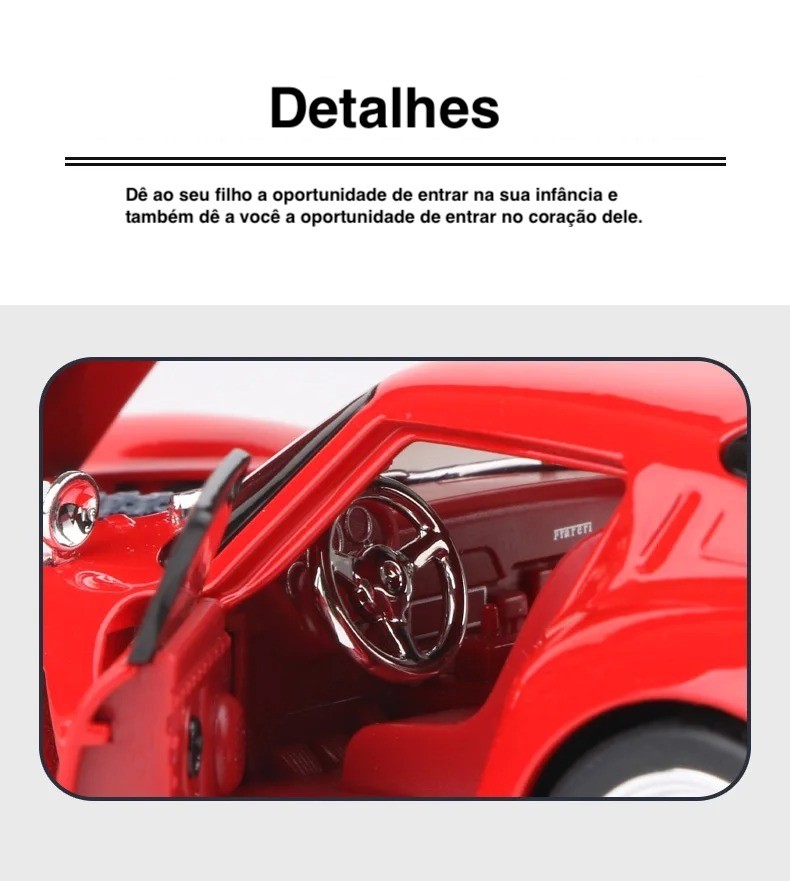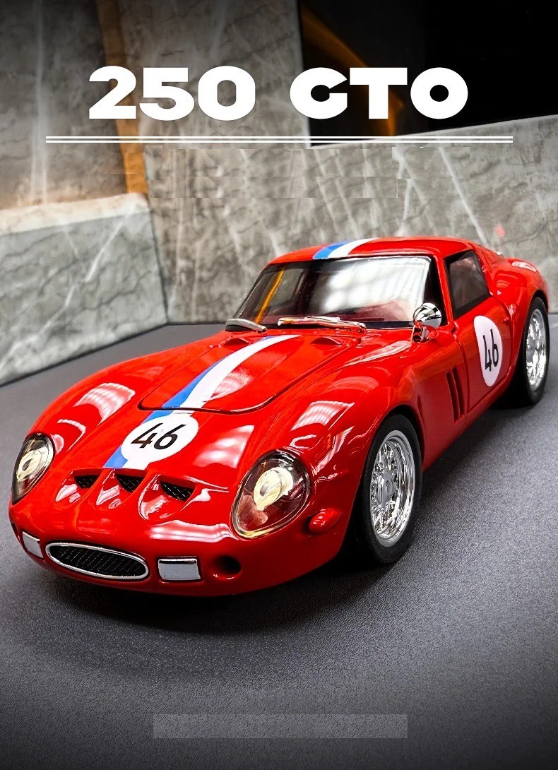 A réplica do lendário 250 GTO foi cuidadosamente desenvolvida para capturar toda a essência do original: capô longo, curvas suaves, grade frontal imponente e a elegância dos esportivos dos anos 60. O modelo é fabricado com liga metálica resistente, rodas emborrachadas e pintura refinada, proporcionando um visual realista que agrada desde o primeiro olhar.